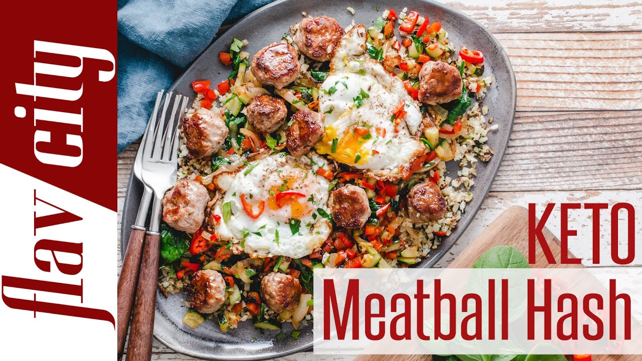 This is the ultimate keto and paleo breakfast recipe for the weekend. The flavors and textures of this mini meatball keto breakfast hash is off the charts, you can easily double the recipe to feed a family. The base of this breakfast recipe is a crispy cauliflower rice hash, topped with sautéed peppers, onions, zucchini, spinach, fried eggs, and turkey meatballs. This is the type of food you want to eat when you are on a keto and paleo diet, and I could not have done it without my sous chef Rose, she cracks me up! Mad love..Bobby, Dessi, Rose, and Art! XOXO