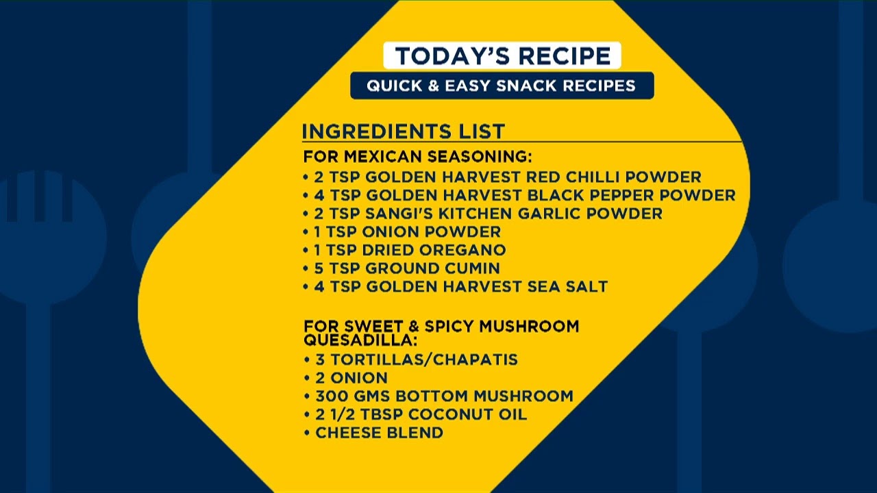 Bacchon ke khane se chutkara pane ke liye Big Bazaar Food aap sab ke liye leke aaye hain 3 tarah ke interesting After school snacks recipes jo aap apne bacho ke tiffin ke liye pack kar sakte ho. Sikhiye Sophia Machado se kaise banate hain Chutney & Paneer Paratha, Sweet & Spicy Mushroom Quesadilla aur Mexican Quesadilla. Judiye humare saath Cook Along Live mein aur sikhiye baccho ke manpasand snacks recipes.