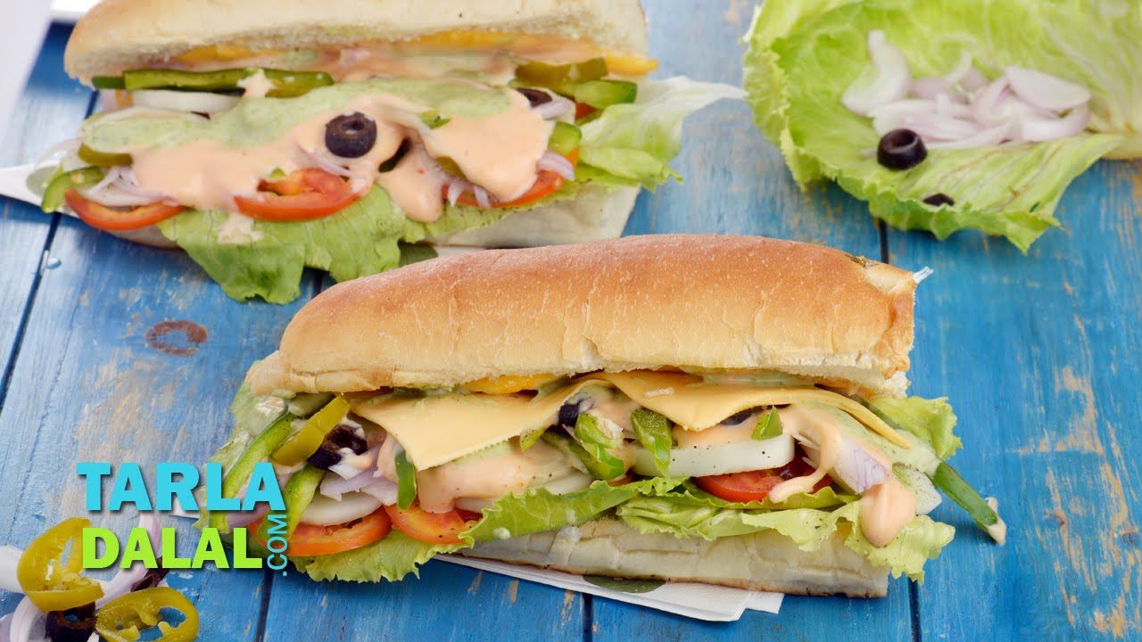 The word Sub immediately brings to mind a satiating sandwich, which is almost a meal in its own right. Well, that’s precisely what this Veg Sub Sandwich is. A whole lot of juice veggies, peppy black olives and zesty jalapenos are arranged along with crunchy lettuce and cheese slices on footlong bread that is lined with mayonnaise and sweet chilli sauce. The use of mint chutney along wth mayonnaise is also a unique move, which gives this Sub Sandwich an Indian touch, which will surely appeal to your taste buds.