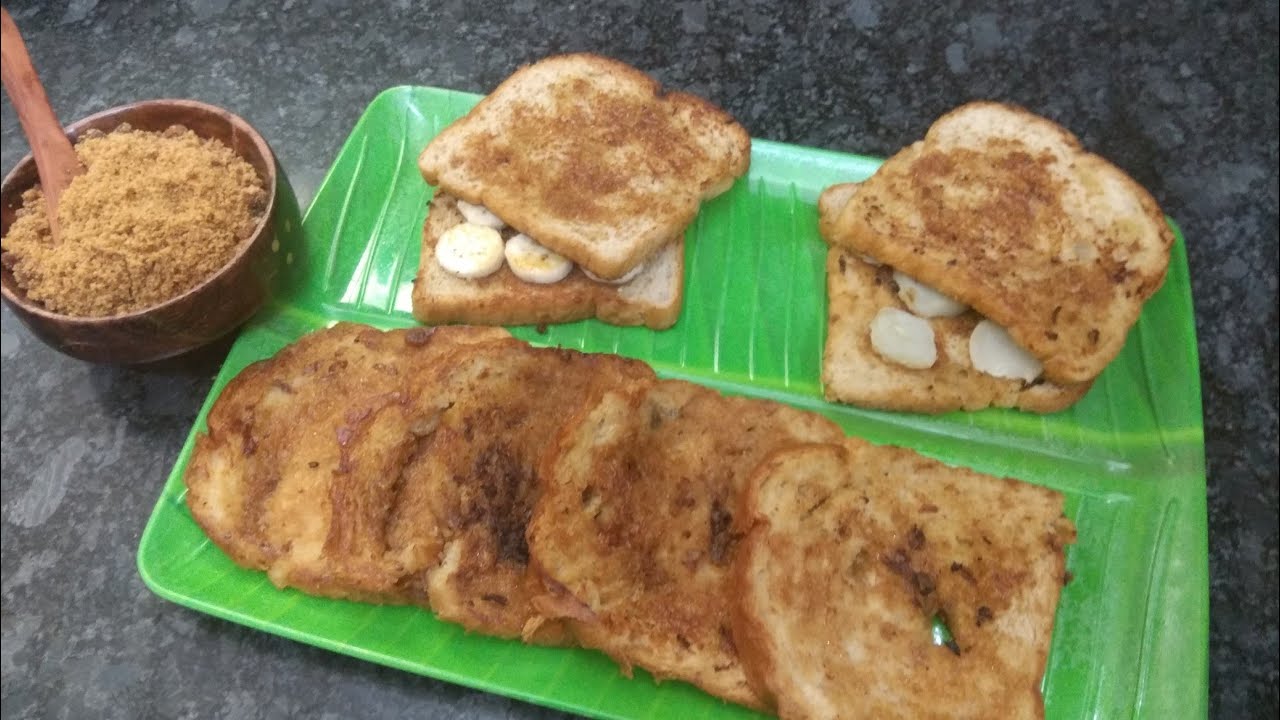 In little milk add jaggery powder, cardamon powder, dry ginger powder, mix. Dip the bread as shown, take at once, toast in tawa with Ghee.