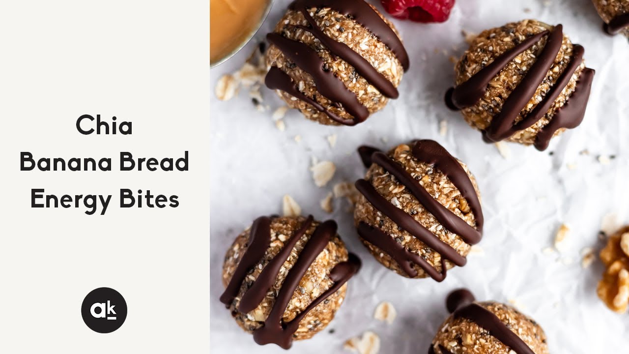 Delicious and easy chia banana energy bites that taste like a slice of your favorite banana bread! These no bake peanut butter banana energy bites are made with creamy peanut butter, banana, heart-healthy walnuts, oats, chia seeds, protein powder and a drizzle of chocolate. Easily vegan & gluten free for the perfect on-the-go snack or breakfast!