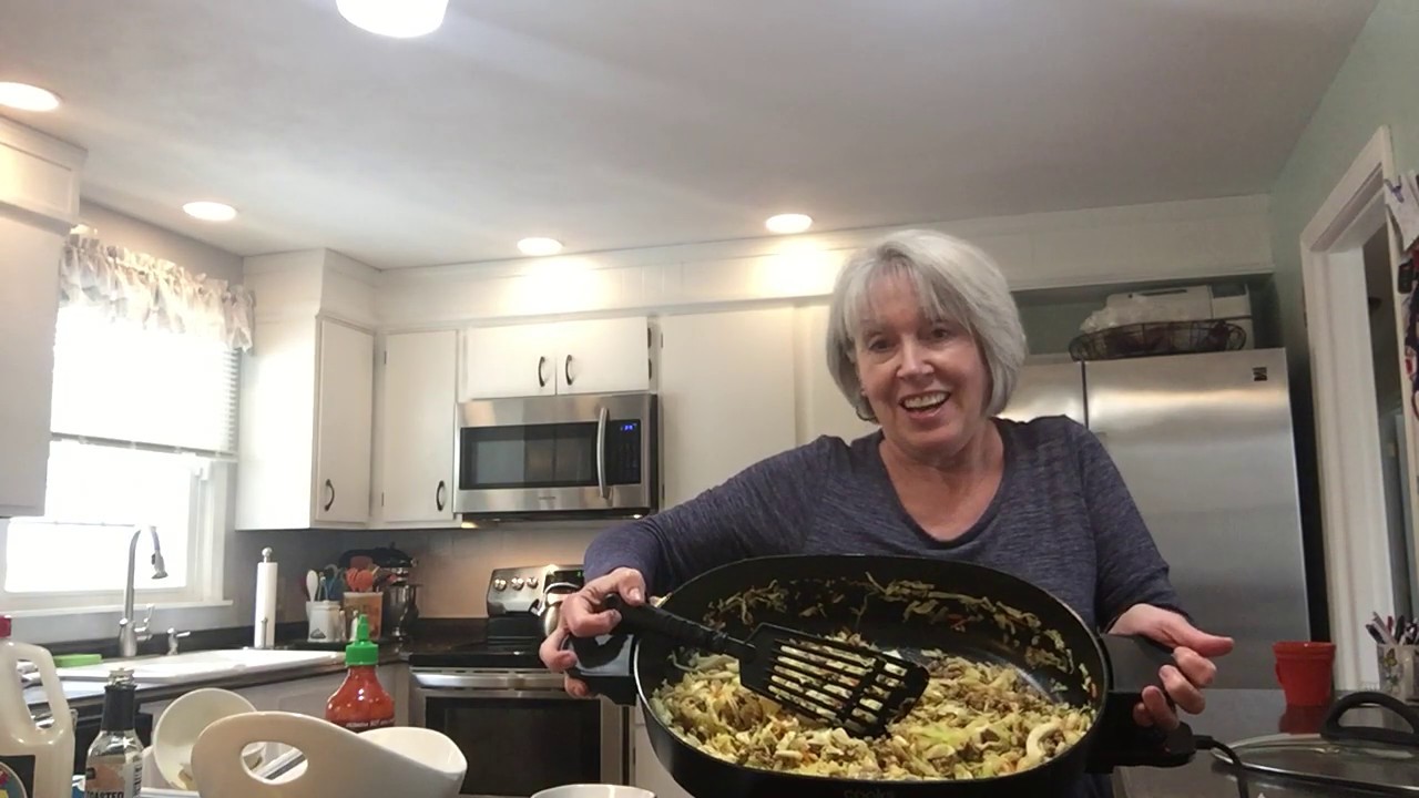In a large skillet, brown the turkey until no longer pink. Drain the meat if it’s really wet. Add the garlic and sautee for 30 seconds. Add the onion, cabbage, carrot, soy sauce, ginger and sautee until desired tenderness. You can add a little water if you need more liquid to sautee the cabbage down.