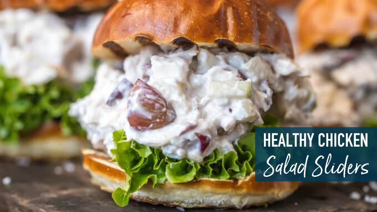 HEALTHY CHICKEN SALAD SLIDERS are just what Summer ordered. They are so fun for showers, parties, or any get together. The best part is you can eat more than one because the base is greek yogurt…guilt free AND delicious. You’ll love this healthy chicken salad sandwich recipe!