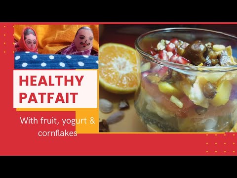 Parfait recipe with cornflakes, fruits and yogurt. Funny characters