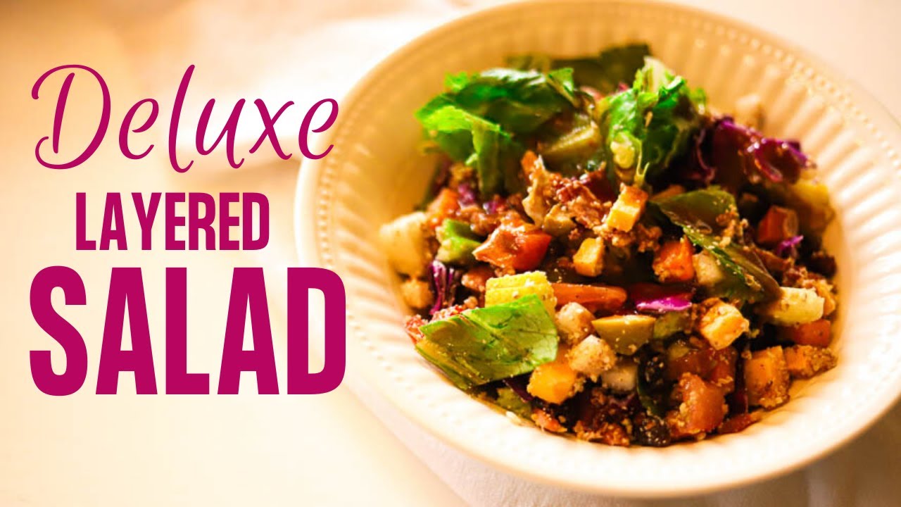 Get a mega-dose of delicious, colorful veggies in this ultimate layered salad recipe!! My husband goes all out, and gives you a full meal in one awesome bowl of deliciousness! He also teaches you how to make an easy, super flavorful balsamic lemon vinaigrette dressing to top it all off.