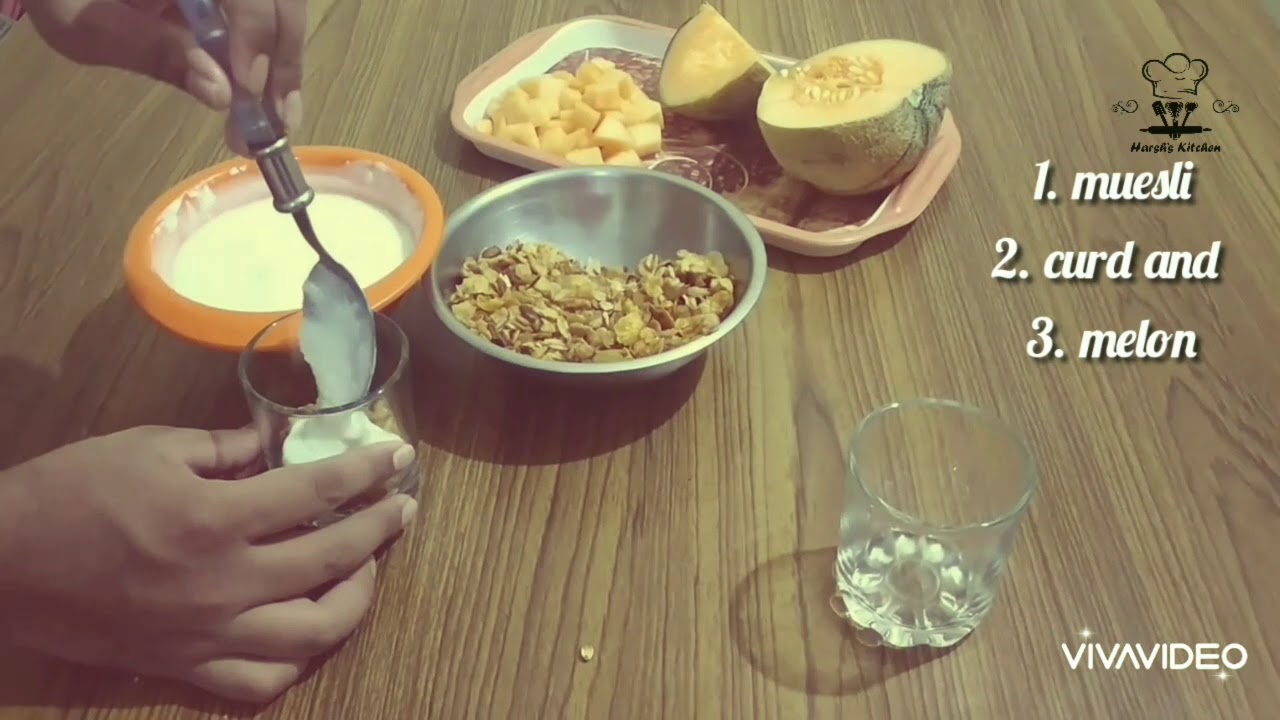 5. Take 2 glasses. Layering of final product. First add curd, then add muesli or granola, then add melons. Repeat same process again . then garnished with extra melon.
