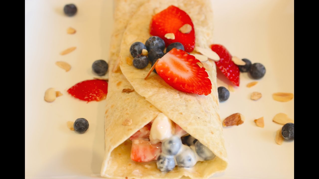 Hi Guys, I’m going to show you how to make a gorgeous and tasty fresh fruit wrap with honey, yogurt, berries and bananas. It’s easy to put together this healthy snack in no time!