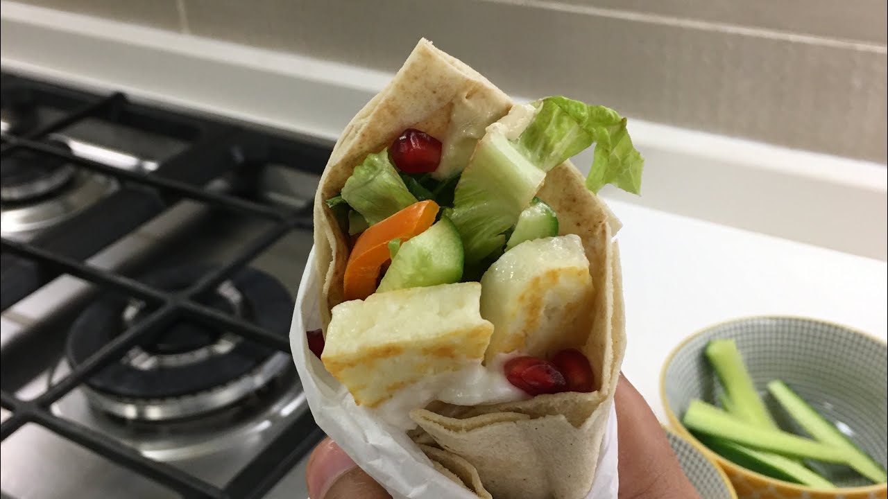3) To prepare your wrap, spread the sauce first and then add fillings of your choice and halloumi