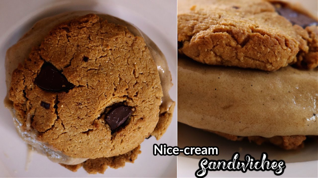 Healthy ice-cream (“nice-cream”) sandwiches that are vegan, dairy-free, and gluten-free!! These ones are vanilla “nice-cream” choc chip cookie sandwiches, and taste absolutely PHENOMENAL!
