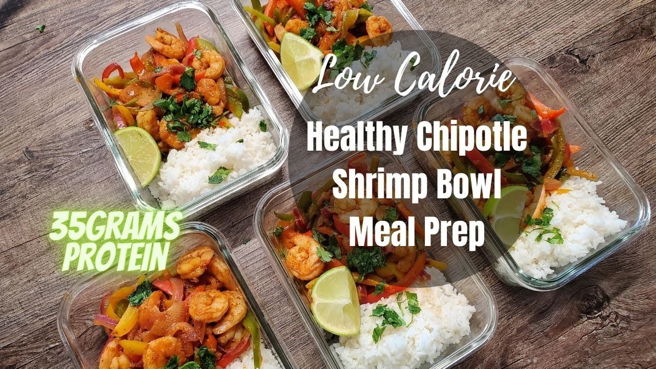 Healthy Shrimp Bowl Meal Prep Recipe. You are going to love this delicious Spicy Chipotle Shrimp Bowl Meal Prep recipe. Low-calorie lunch recipe. 360 calories per Shrimp Bowl, 5.6 grams of fat, 38 grams of carbohydrates, and 35 grams of protein.