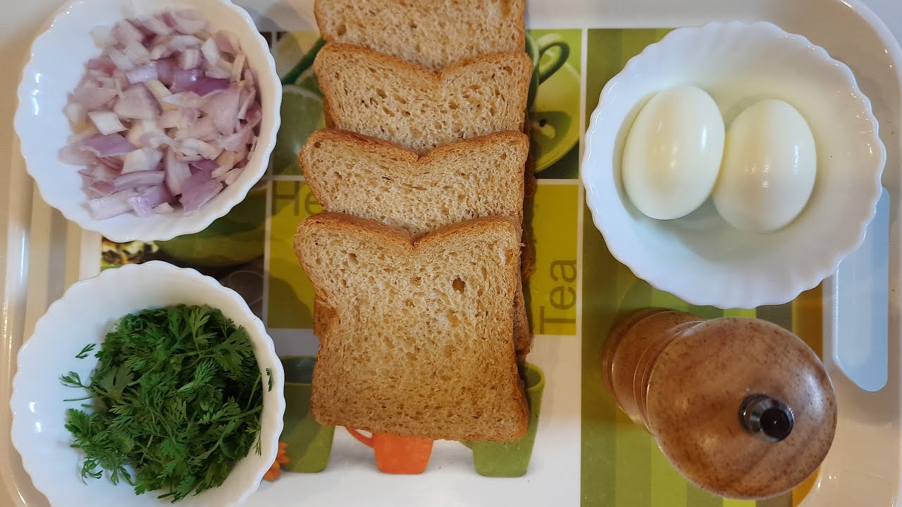 Toast slices of wheat bread with ghee on both sides and keep it aside. Take a slice of toasted bread to it add slices of boiled egg, finely chopped onions, some coriander. leaves.