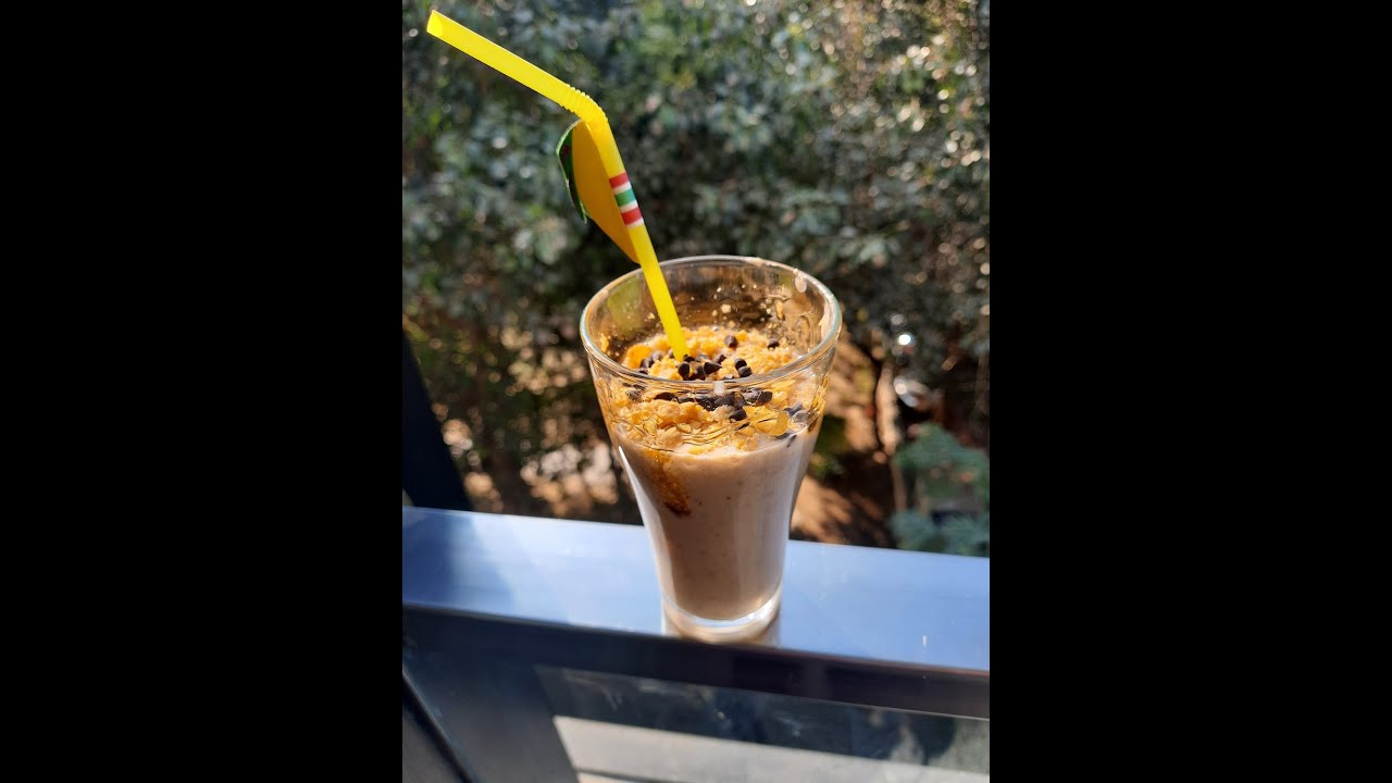 2 Bananas 1/2 tsp of peanut butter dry fruits ( almonds , pistachio,raisins) 1 tbsp of maple syrup 1tsp of vanilla essence 2tbsp of milk crushed cornflakes (garnishing) choco chips (garnishing) almondsampbananabananascashewsChefcookingCuisineFeastGlasshealthyHealthy Cuisinehealthy recipeshealthyrecipesLovePistachioquickraisinsreciperecipessmoothiesmoothiesVideoVlogYouTube