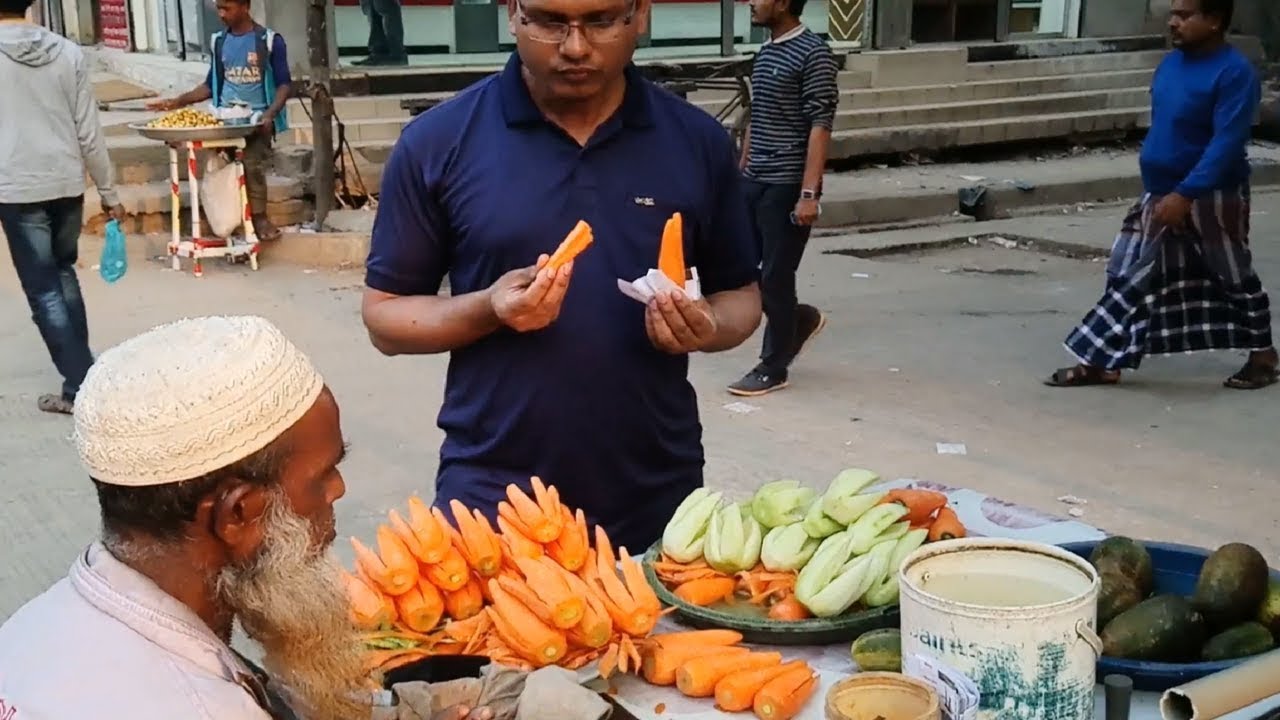 65 Years Old Man Selling Pure Natural Healthy Foods Carrot & Cucumber @ Tk 5 per piece Non veg street food of Dhaka City Mirpur No-01 in Bangladesh.