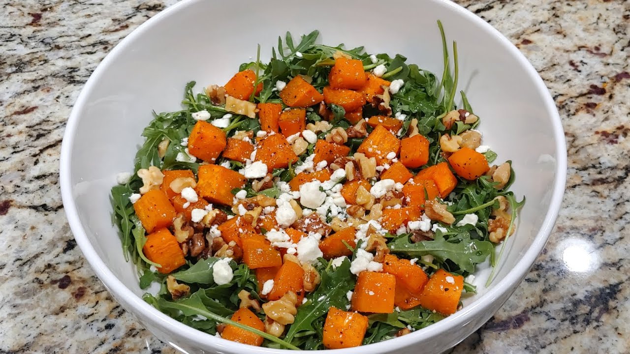 Sweet potato salad is healthy and very easy to make! Roasted sweet potatoes, arugula, walnuts and feta cheese are so delicious in this salad! This sweet potato salad recipe is healthy, nutritious and great as a side dish to meats, salmon and as a separate light lunch.