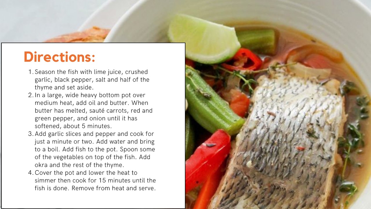 Add garlic slices and pepper and cook for just a minute or two. Add water and bring to a boil. Add fish to the pot. Spoon some of the vegetables on top of the fish. Add okra and the rest of the thyme.
