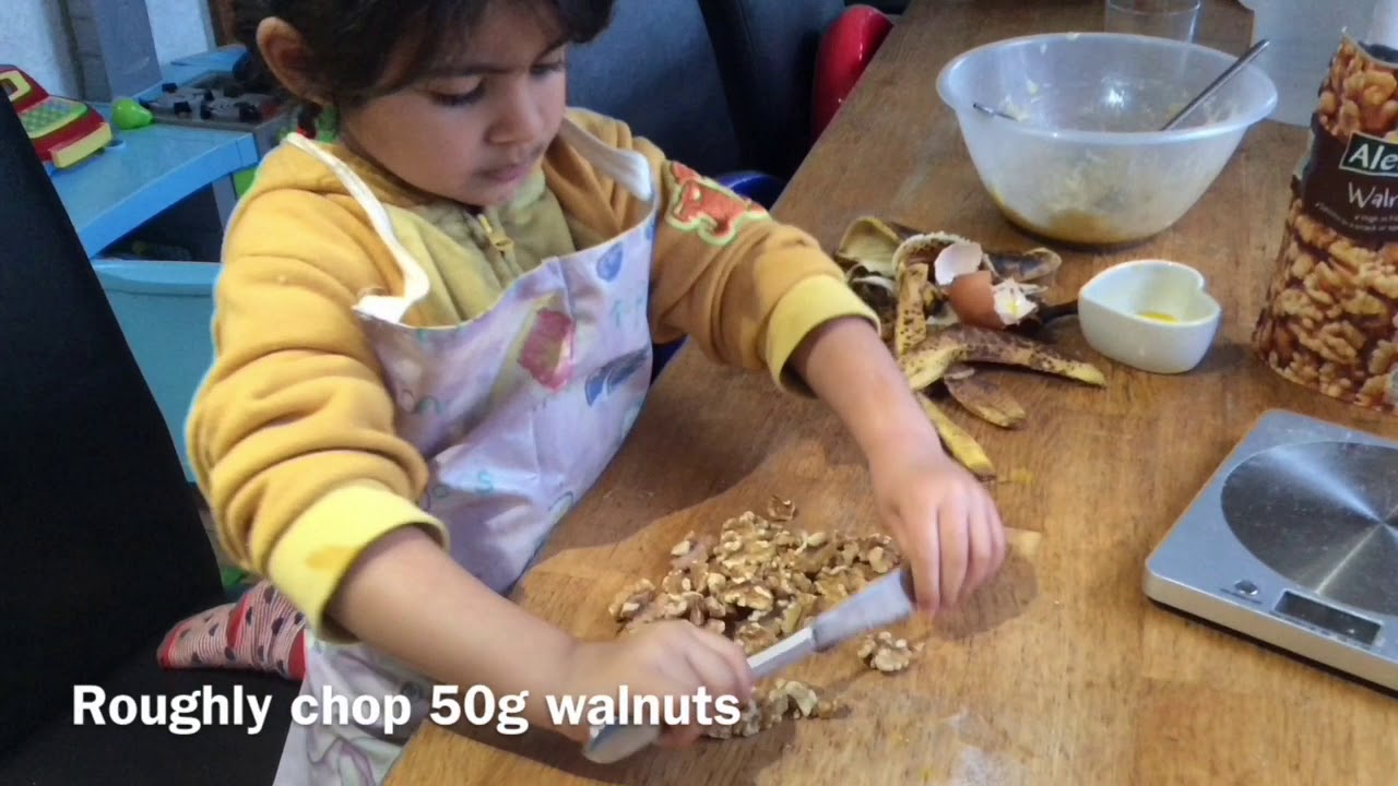 7 year old Ayman follows a recipe and bakes banana bread with the help of his little sister Jennah, 3.