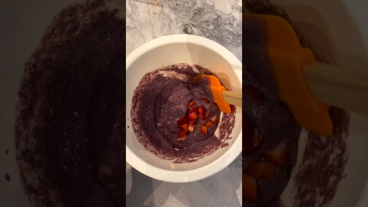 3. Grease 2 ramekins and pour half the batter into each. Top off with the remaining strawberries (1/6 cup).