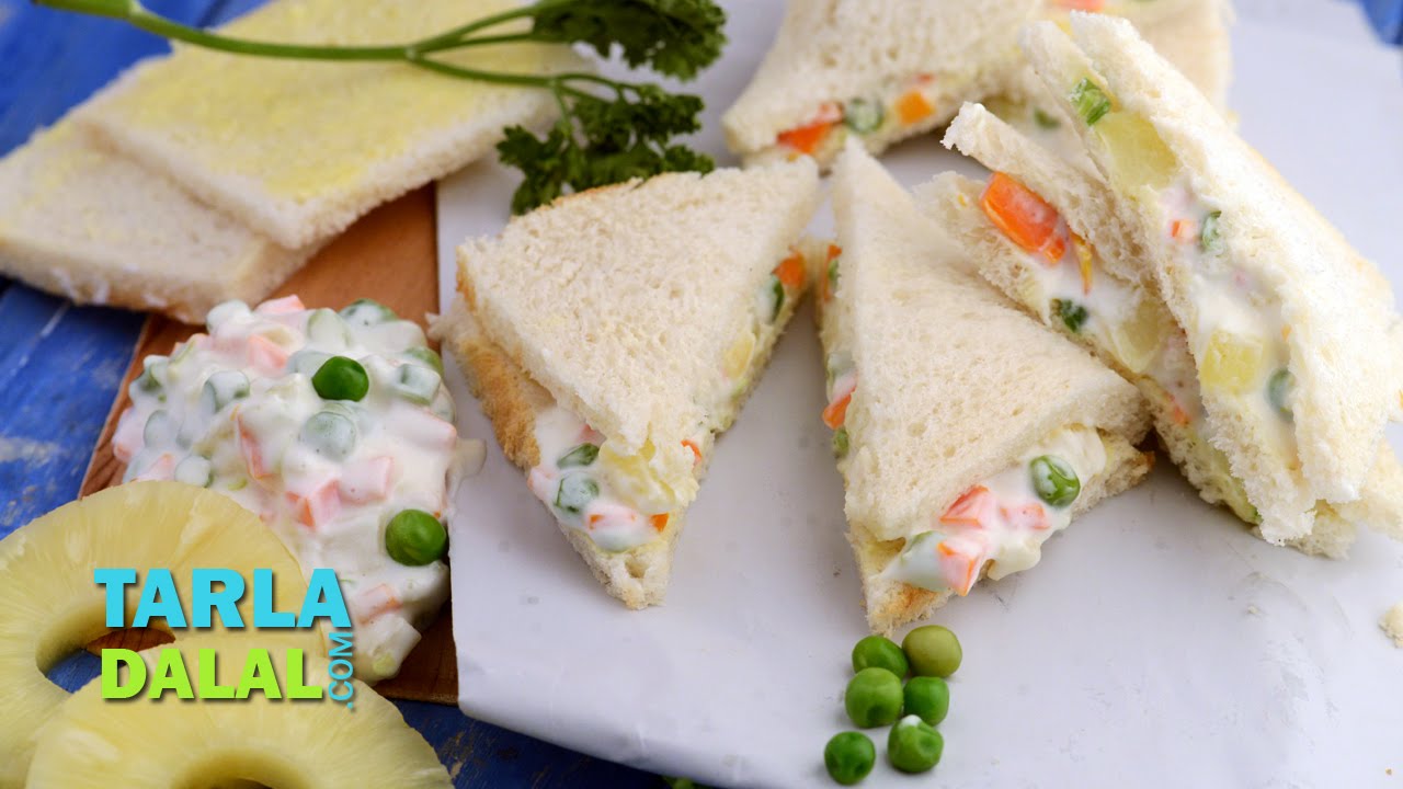 Russian salad sandwich is a cold sandwich that is perfect for hot summer afternoons. The chopped pineapple contrasts well with the remaining ingredients, and adds a crispy, tangy feel to the sandwich. Use freshly-crushed pepper for best flavour and aroma.