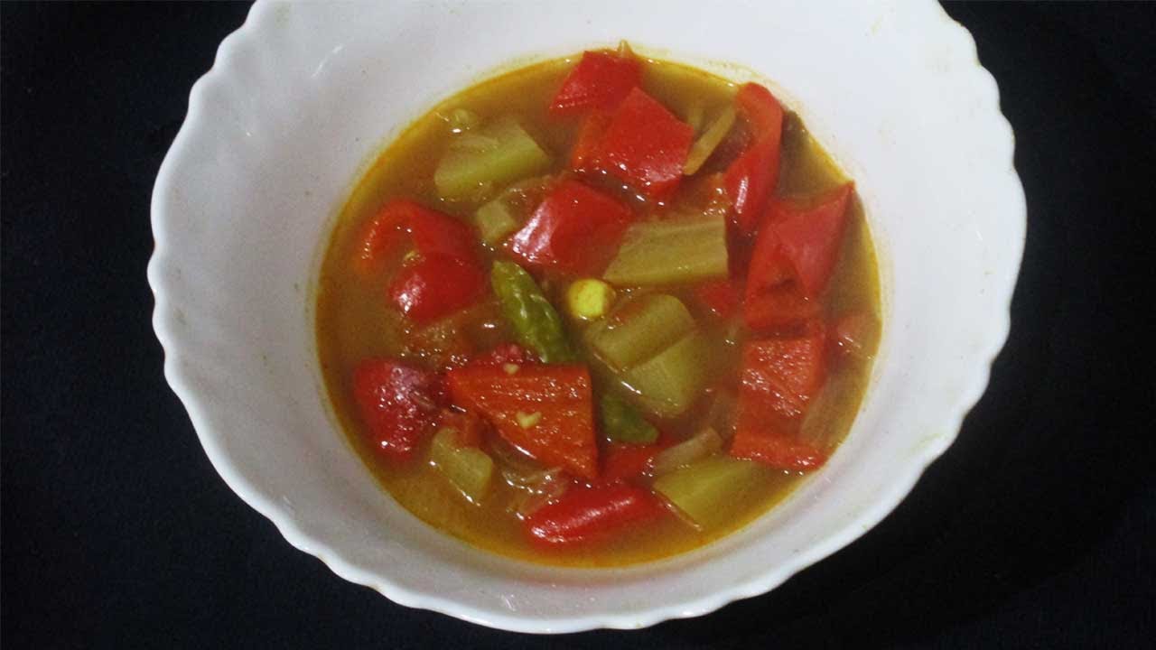 Heat the pan and pour in 10 ml of oil. Put in the pieces of one onion and saute well. Add 25 gms of ginger an 25 gms of garlic and saute and mix well. Add the pieces of one tomato and saute well. Add the pieces of one chayote and one bell pepper which has been marinated in mustard paste and saute and mix well. Add salt to taste and a spoon of mixture of spices and saute and mix thoroughly. Pour in 200 ml of water and mix and let the mixture cook for 15 minutes in the pressure cooker. Take off the pan and serve.