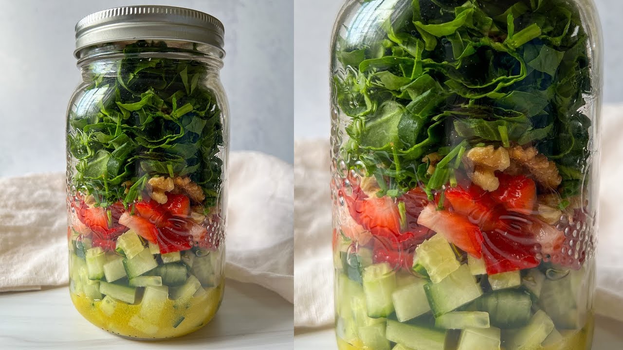 I had so many requests and messages asking me to show you how we can meal prep my delicious strawberry salad that I posted two days ago. There is a specific method so you have to add in the ingredients exactly how I’m showing you. You do not want to have anything that can go soggy near the dressing. All the firmer fruits and veggies should be at the bottom and anything like lettuce etc should be at the very top. You are also more than welcome to make the dressing separately in another small jar and just pour on top as you serve which should last even longer. If you are plant-based I would suggest you use regular Dijon mustard and add maple syrup or agave to it. There is no exact recipe as you can taste and adjust and add as much or as little veggies as you like. This recipe makes one large portion. You will need: