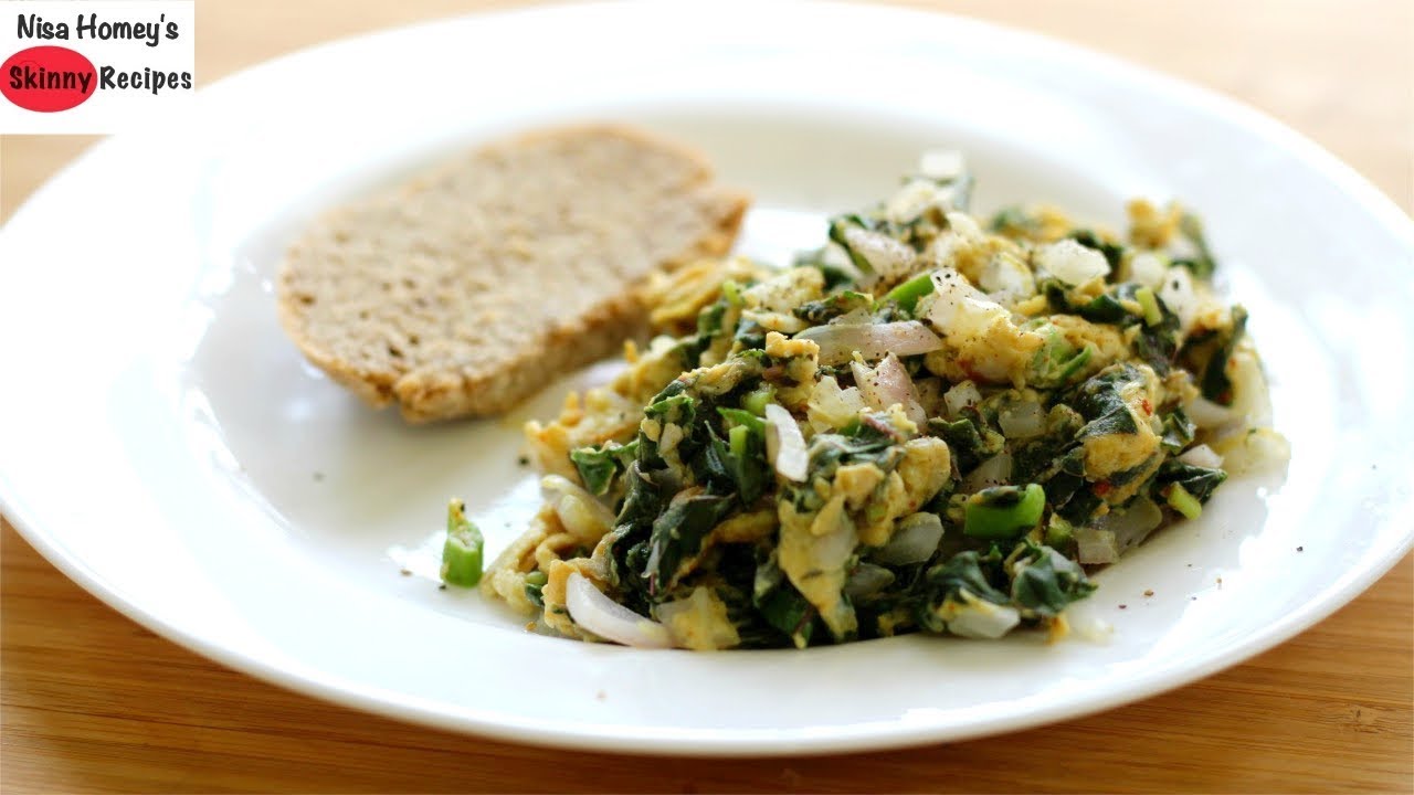 Weight loss breakfast recipe, healthy high protein scrambled eggs and spinach with homemade whole wheat bread