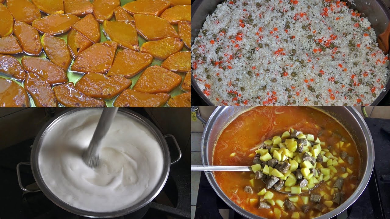 Turkish dinner menu recipes, juicy meatballs with potatoes, vegetables, carrots, peas, rice pilaf, thin noodle soup made with chicken stock, and pumpkin dessert 4 different recipes prepared in one video