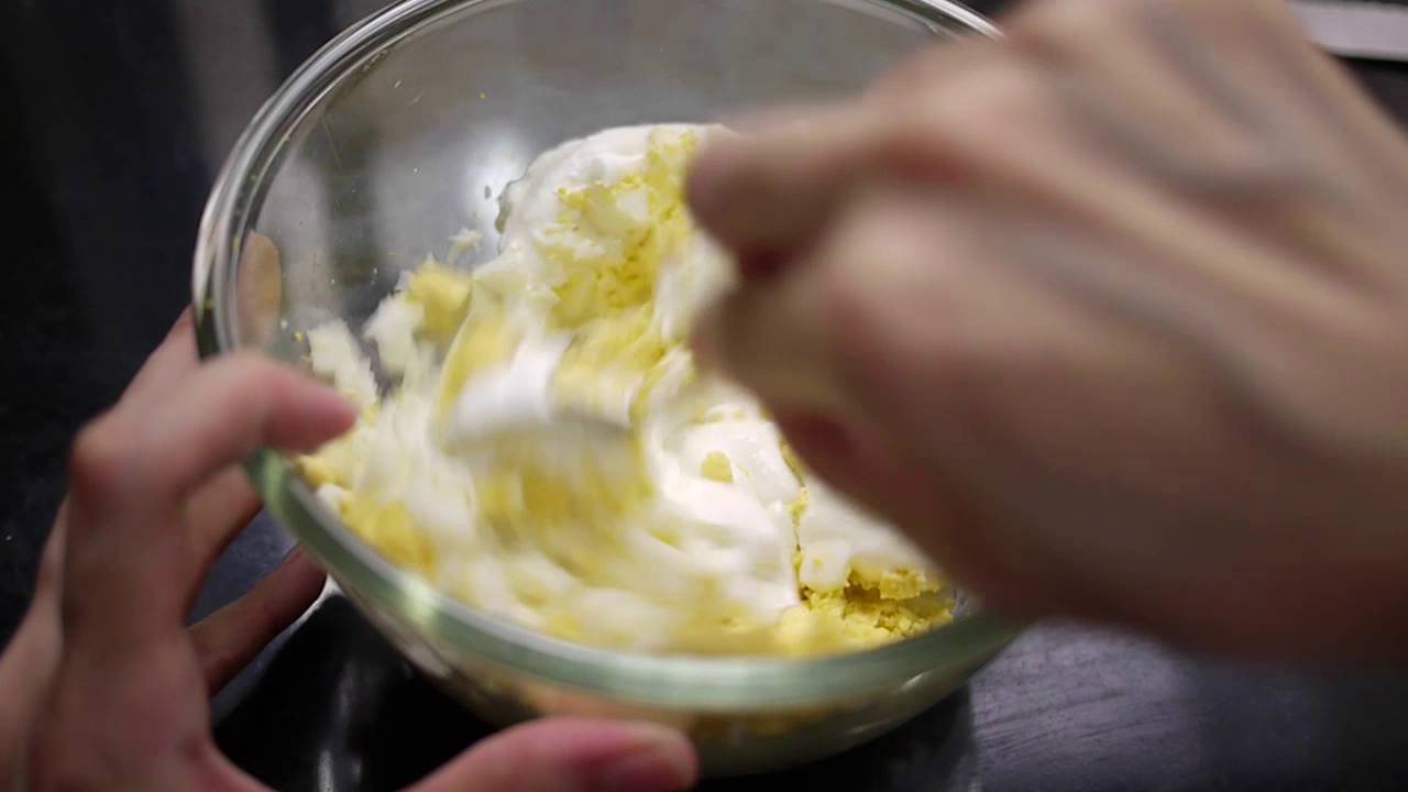 A 15 seconds video on how to make a healthy egg salad sandwich which uses just greek yogurt, and no mayo.