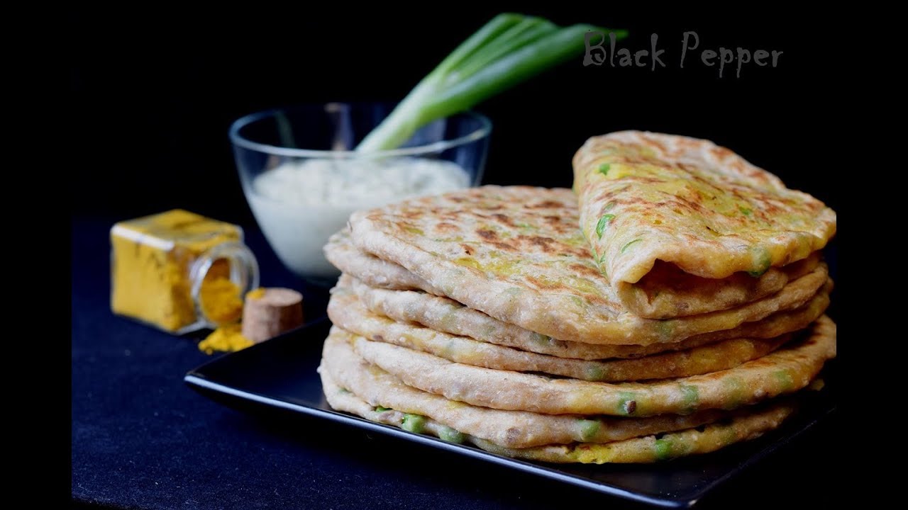 Spicy curry pancake with potato filling with fresh peas served with delicious healthy low-calorie yogurt sauce Raita – easy breakfast recipe inspired by Indian cuisine. Healthy eggless no baking powder pancakes dough with spiced potato filling with curry and coriander, delicious Raita sauce with yogurt and cucumber. Try this perfect low-calorie breakfast recipe. A proven step-by-step No Talk recipe from Black Pepper Chef.