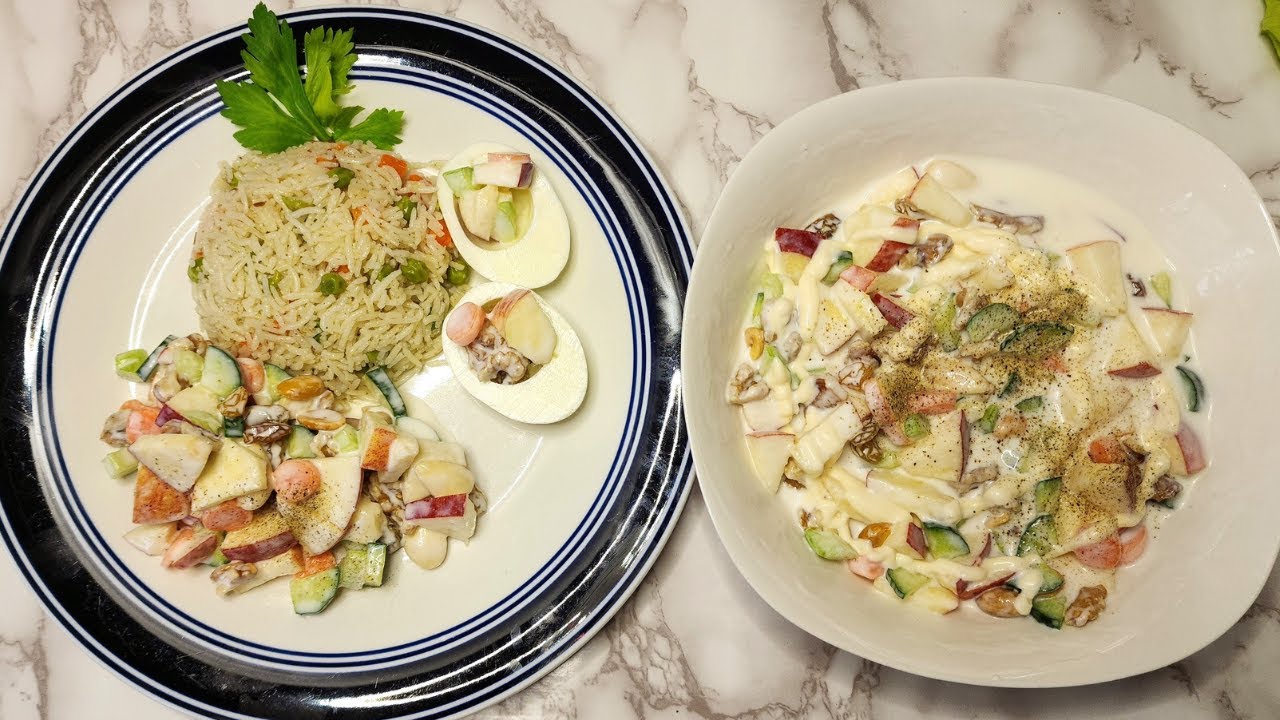 Mix a little mayonnaise into a cup of yogurt. Add cut apple, cucumber, carrots, and kiwi. Mix all the ingredients well. Add raisins, walnuts, peanuts, and almonds. Serve with boiled rice and boiled eggs.
