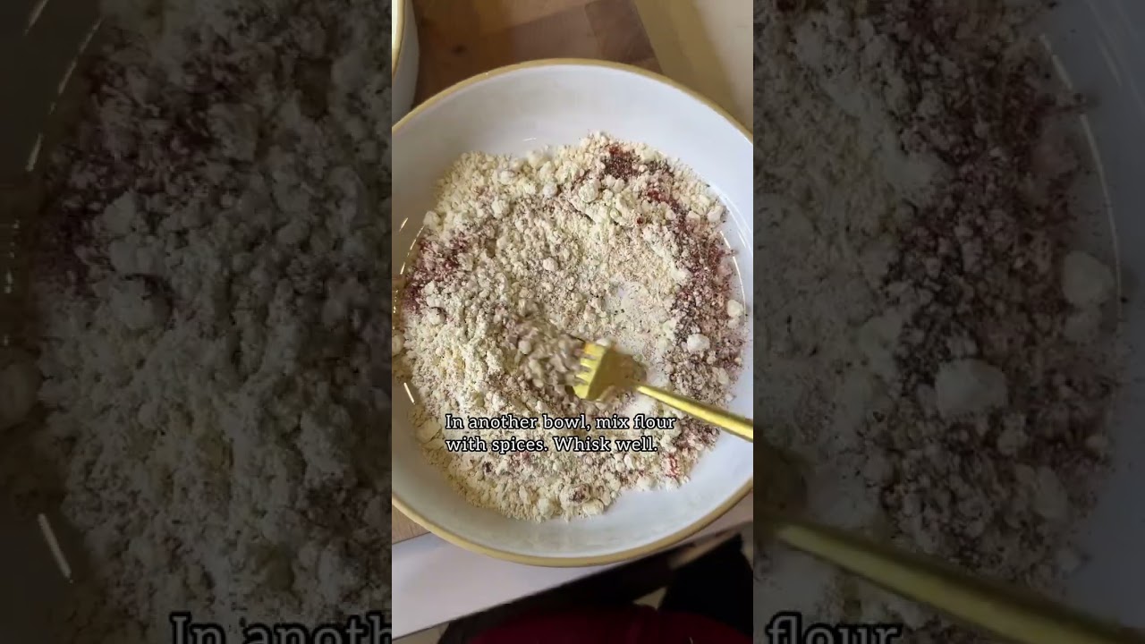 2️⃣ Add chicken into the wet mixture, then the dry, shake off any excess coating.