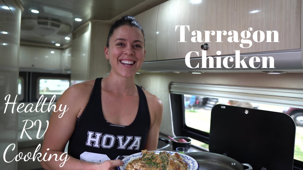 RV cooking does not have to be out of a box or a freezer. This tarragon chicken recipe is luxurious, quick, simple and all cooked in my tiny class b RV. What else could you ask for? I use boneless skinless chicken thighs along with coriander and dried mustard for the chicken seasoning. The seasoning leaves a nice “crust-like” sear on the chicken and goes so well with the flavor of the fresh herbs.