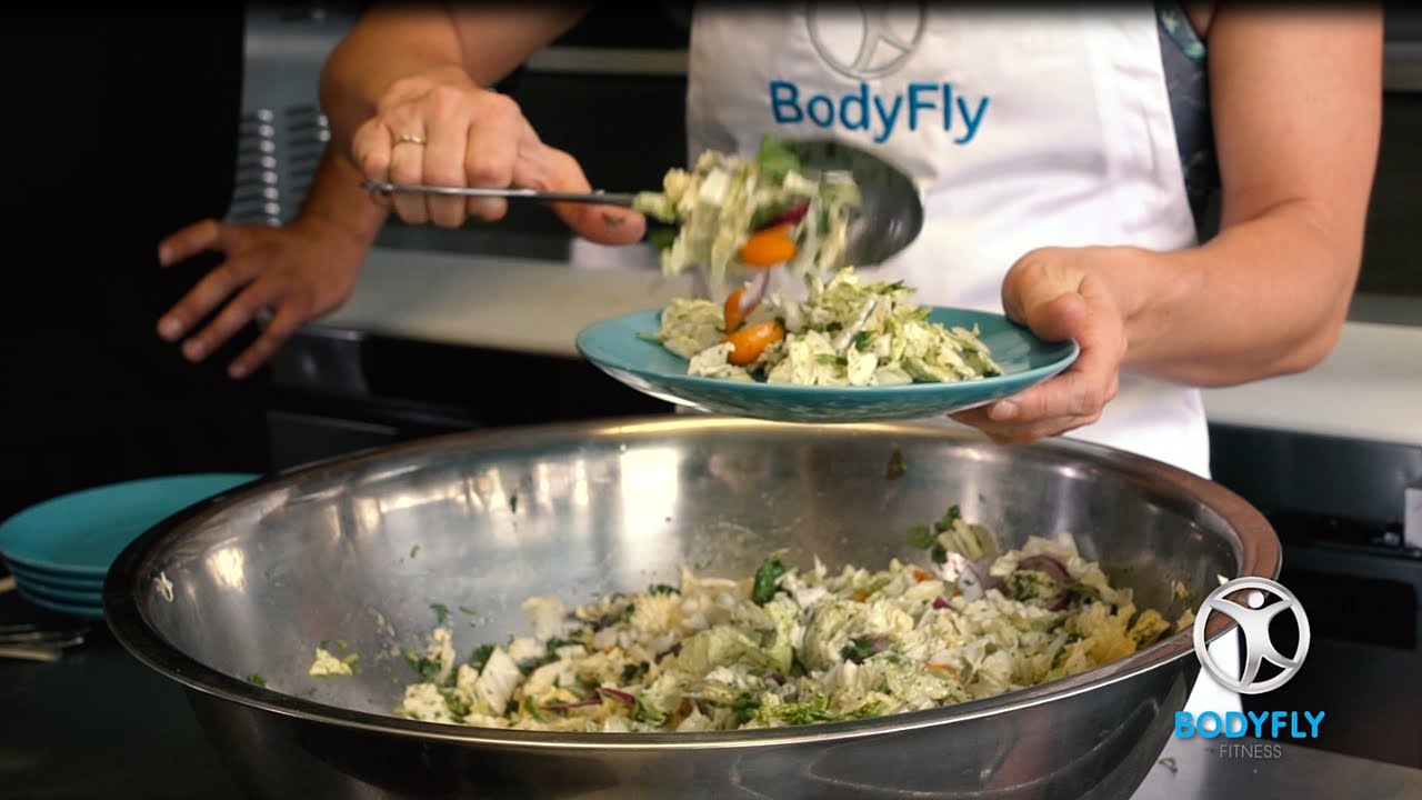 This is a simple and healthy summer salad recipe that you can make in bulk and enjoy throughout the week. Chop up the napa cabbage and place into a large mixing bowl. Add the red onions sliced up and then the kumquats which we half and finally add in 2 heads of cilantro cut up.