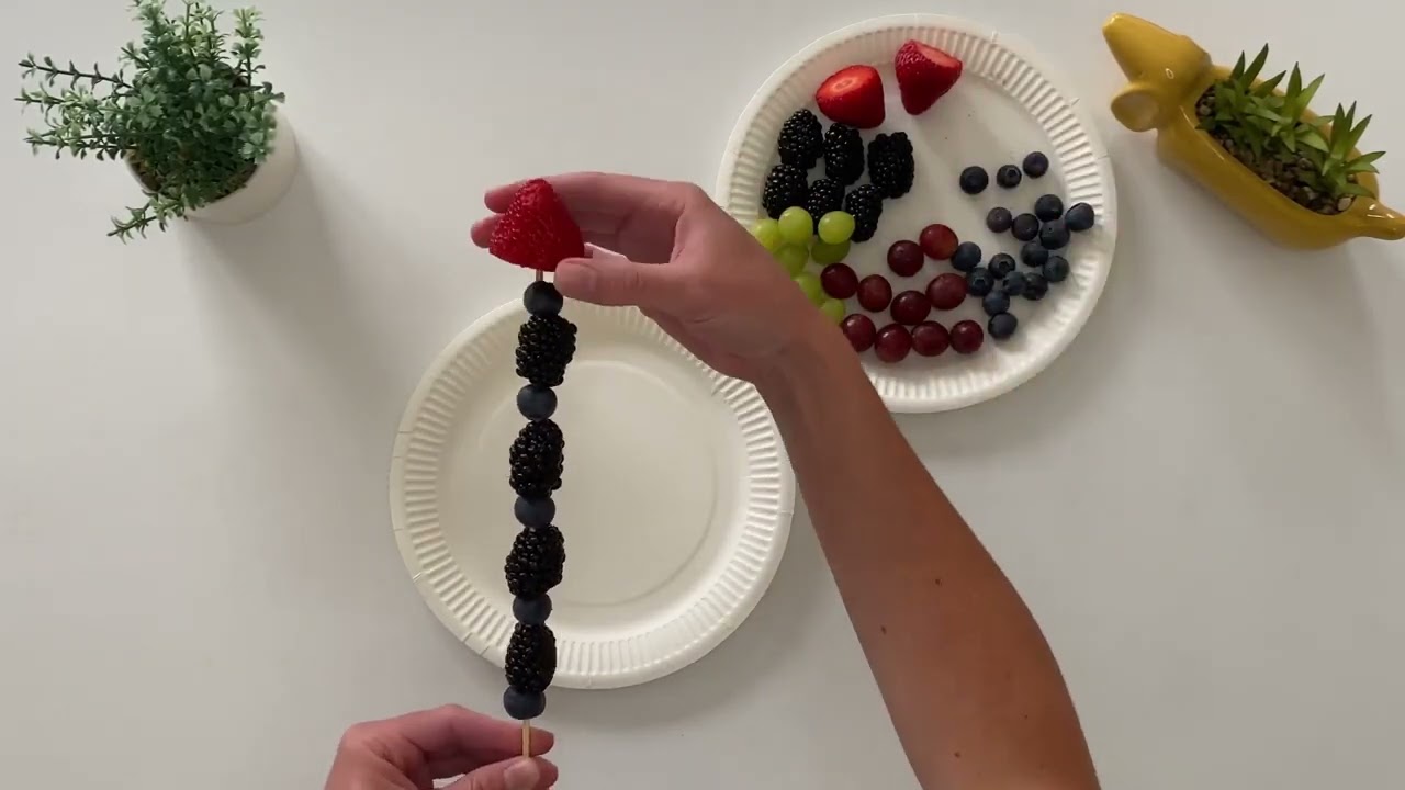 0:18 Children can carefully add the fruits to the skewers. Can they make a pattern?