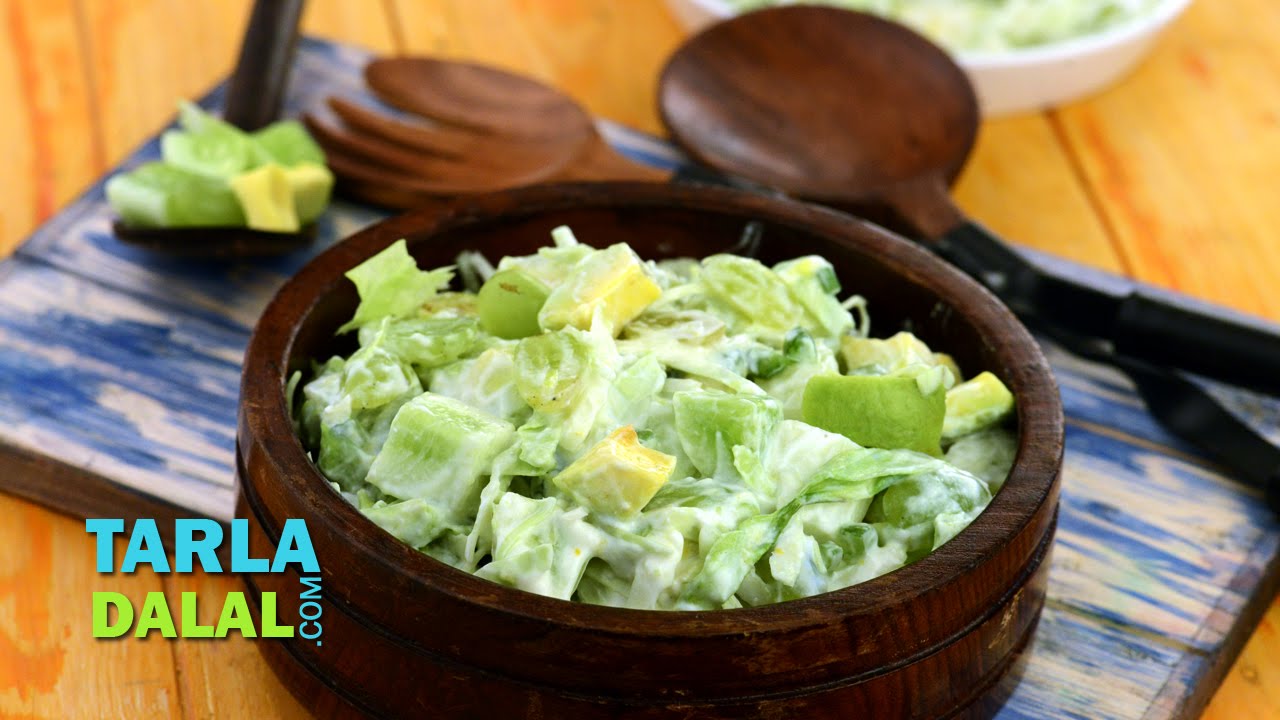 A truly exotic combination of greens, cucumber and avocado is perked up with tangy grapes, and laced with a peppy honey-curd-mustard dressing, resulting in a tongue-tickling but heart-friendly salad. Although avocado is high in fat, it contains good fatty acids (mono unsaturated fatty acids) that help to lower blood cholesterol. Plus, the ample vitamin C content of this recipe helps to maintain the lining of the arteries. All the more reason for those who love their heart to love this wonderful Green Salad with Honey and Curd Dressing.