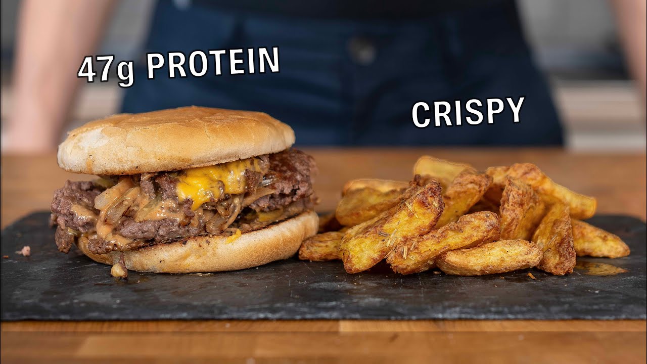 Meanwhile prep all burger ingredients and make the sauce by combining all ingredients in a small bowl and mixing until smooth. Form 2 beef balls out of the meat and place a small piece of parchment paper on top. Preheat a cast iron pan at medium heat, add in some oil, and then the diced onions with a pinch of salt. Fry onions for 2-3 minutes. Toast burger buns for 30 seconds, remove them, and add half the sauce on top of the bottom bun. Add the burger balls to the pan and press them down with a spatula and something heavy to form flat burger patties. Remove parchment paper and add some salt on top of the patties.