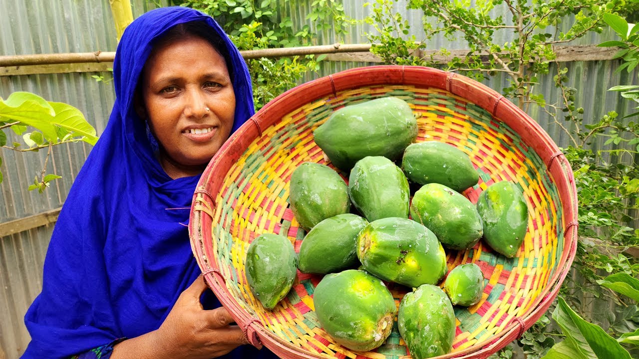 Village Food RAW PAPAYA FRY COOKING Top Healthy Vegetarian Meal New Style Veg Curry Pepe Vaji Recipe By Deshi Food Channel.
