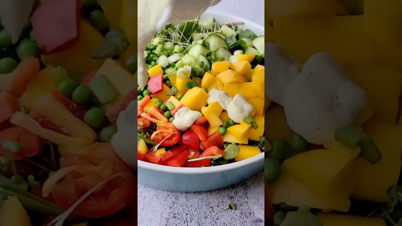This delicious salad is packed with delicious veggies, mango, and clean protein. Simple and quick to make for lunch. By @splashofgoodness