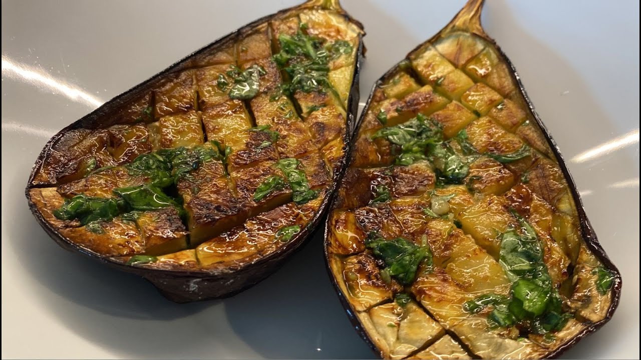 Wash and dry eggplant. Cut it in half, add salt and oil it with a olive oil. Bake it in a preheated oven 400°F/200°C for about 40-45 minutes.