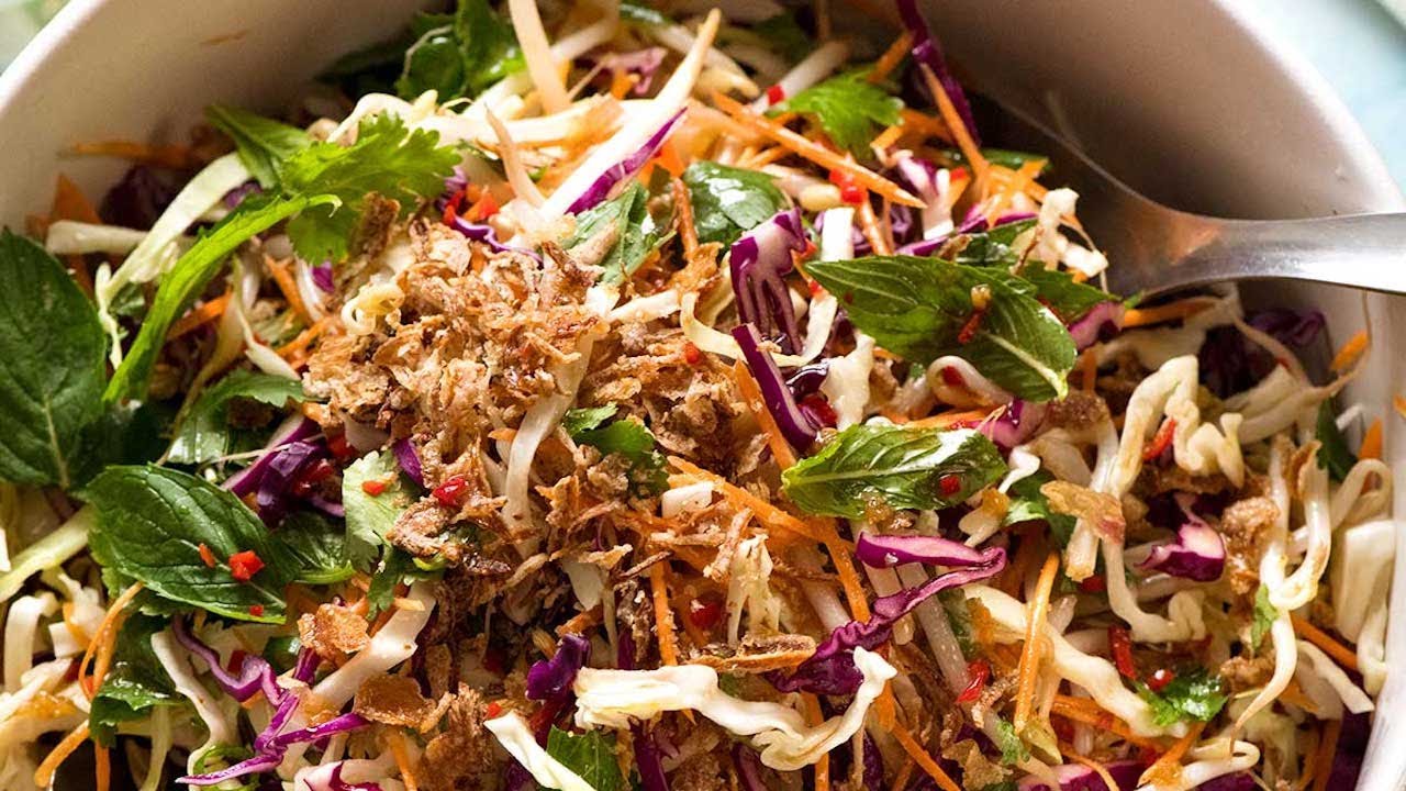 This is a terrific fresh, crunchy Asian salad that I call an Asian Slaw because it has shredded cabbage and carrot like traditional Coleslaw. The fresh herbs and Asian Dressing infused with Thai flavours makes this oriental salad extra special. Delicious AND healthy!