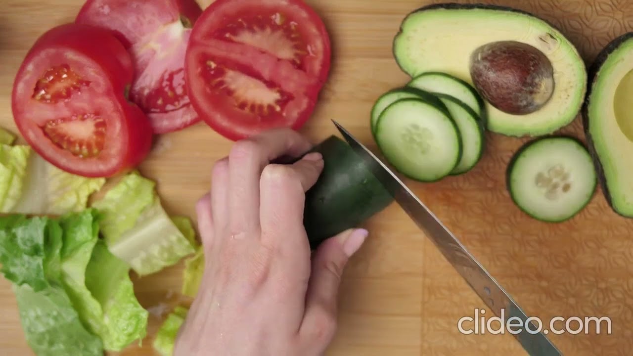 slicing vegetables on a board to prepare a healthy salad.