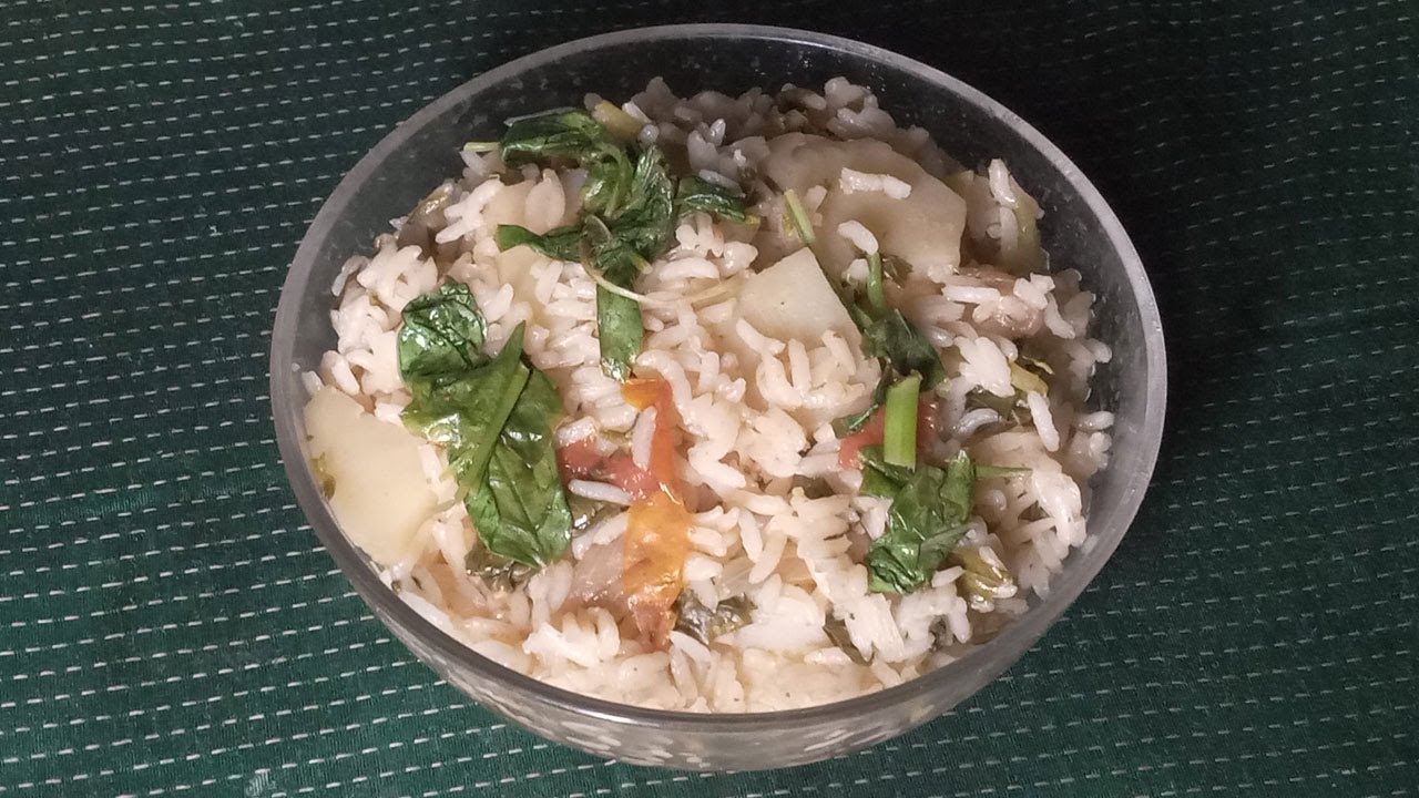 Heat the pan and pour in 10 ml of oil. Put in the pieces of an onion and saute well for 5 minutes. Put in 15 g of garlic and 15 g of ginger and saute well. Put in the salt to taste and a quarter spoon of mixture of spices and mix and saute well. Put in the pieces of one tomato and saute well. Put in the pieces of 100 g of potatoes cut into pieces and saute for 5 minutes.Put in the 100 g of green spinach and saute well for 20 minutes. Squeeze in the juice of half a lemon and mix well.Add a cup of washed and soaked rice and mix. Add 2 cups of water and mix and let the mixture cook for 15 minutes in the pressure cooker . Put in some curry leaves and saute for 3 minutes.Take off the flame and serve.