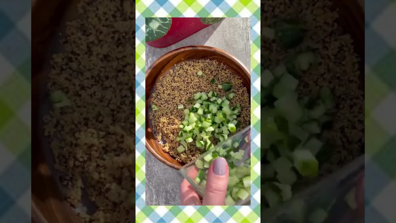 Chop beetroot and cucumber into small bite-sized cubes and toss in with the quinoa. Add the herbs and pomegranate seeds.