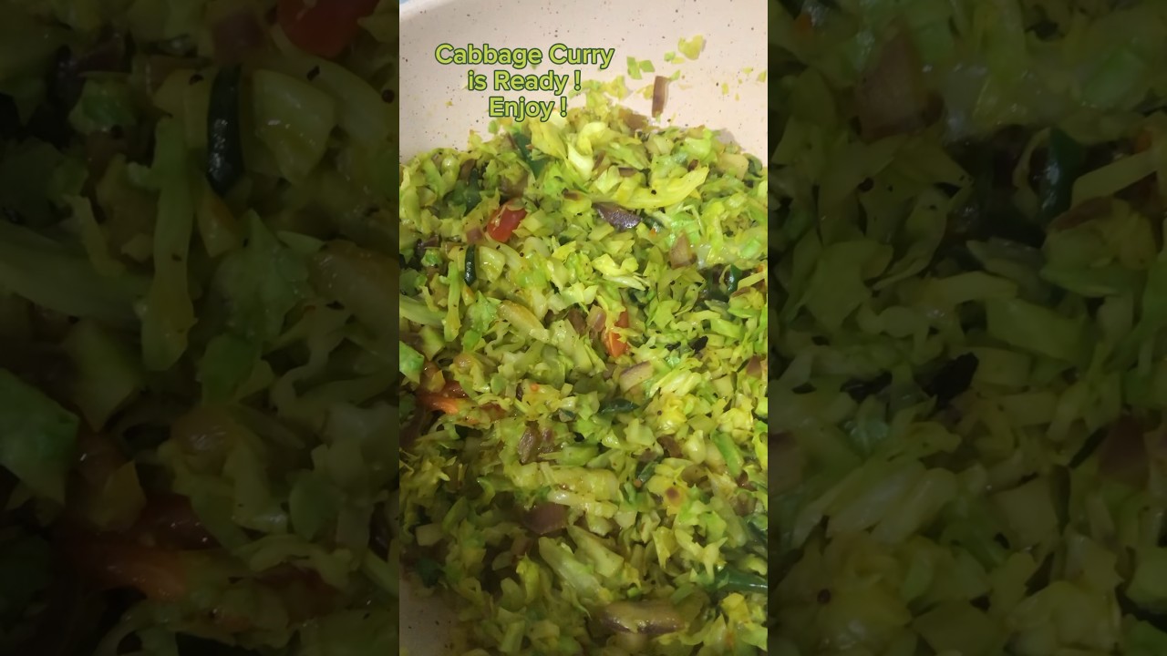 Let’s make cabbage cut cabbage onion garlic Curry leaves green chilies to pan add mustards Curry leaves garlic dried fish chips onion now add chili flak and low heat add cabbage into pan mix mix add salt black pepper turmeric and Cherry tomato cabbage Curry is ready enjoy