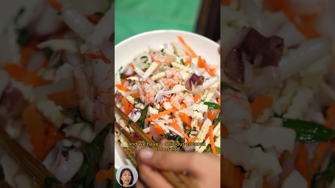 Do you know coconut core this is a specialty dish in Vietnam coconut core are delicious when used as a salad with shrimp and pork after washing the coconut core we will make fibers add a little carrot for added appeal soak thinly sliced coconut core in ice water for about 10 minutes