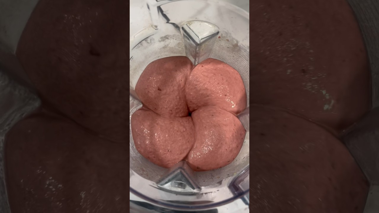 This strawberry and banana smoothie is to live for seriously it’s so healthy so easy and so delicious all you need is some frozen strawberries frozen bananas a little bit of mixed berries if you want a greens powder and a vanilla plant protein from Sun Warrior I also add Gia