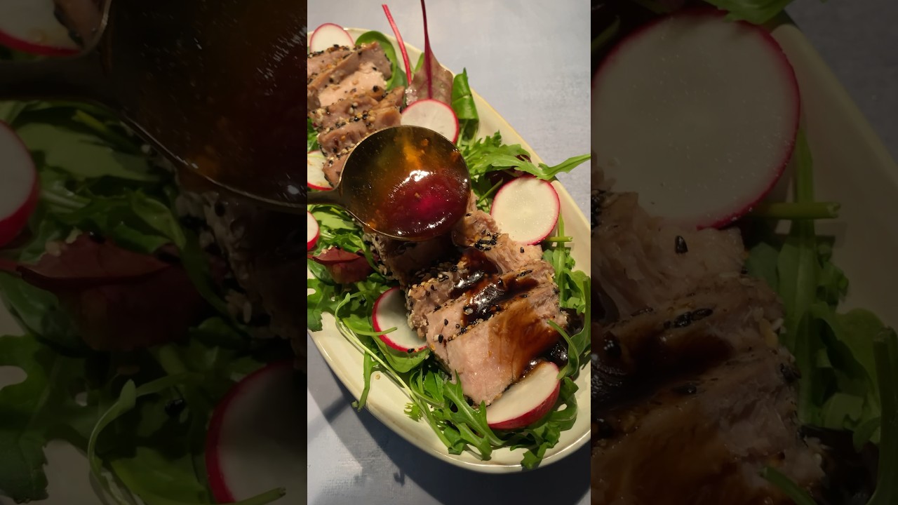 Absolutely delicious sesame-crusted tuna steak served with a vibrant green salad, drizzled with a tantalizing sauce crafted from soy sauce, honey, garlic, and a touch of olive oil for a perfect blend of flavors!