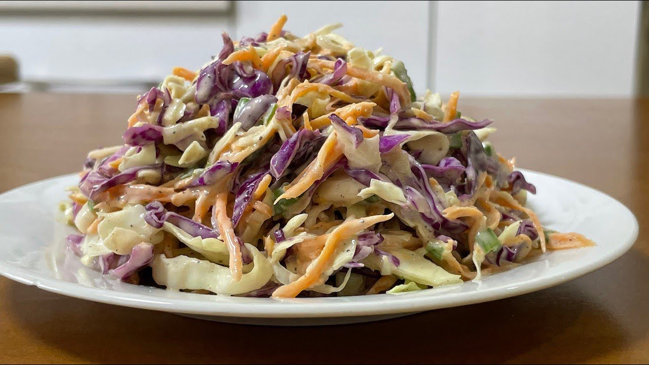 Healthy and low-calorie salad recipe: 1 / 2 cabbage 1 / 2 red cabbage 2 carrots 1 green onion 1 / 2 lemon 2 spoons of Tahini 2 spoons of yogurt 1 small spoon of honey 1 small spoon of black pepper 1 small spoon of salt