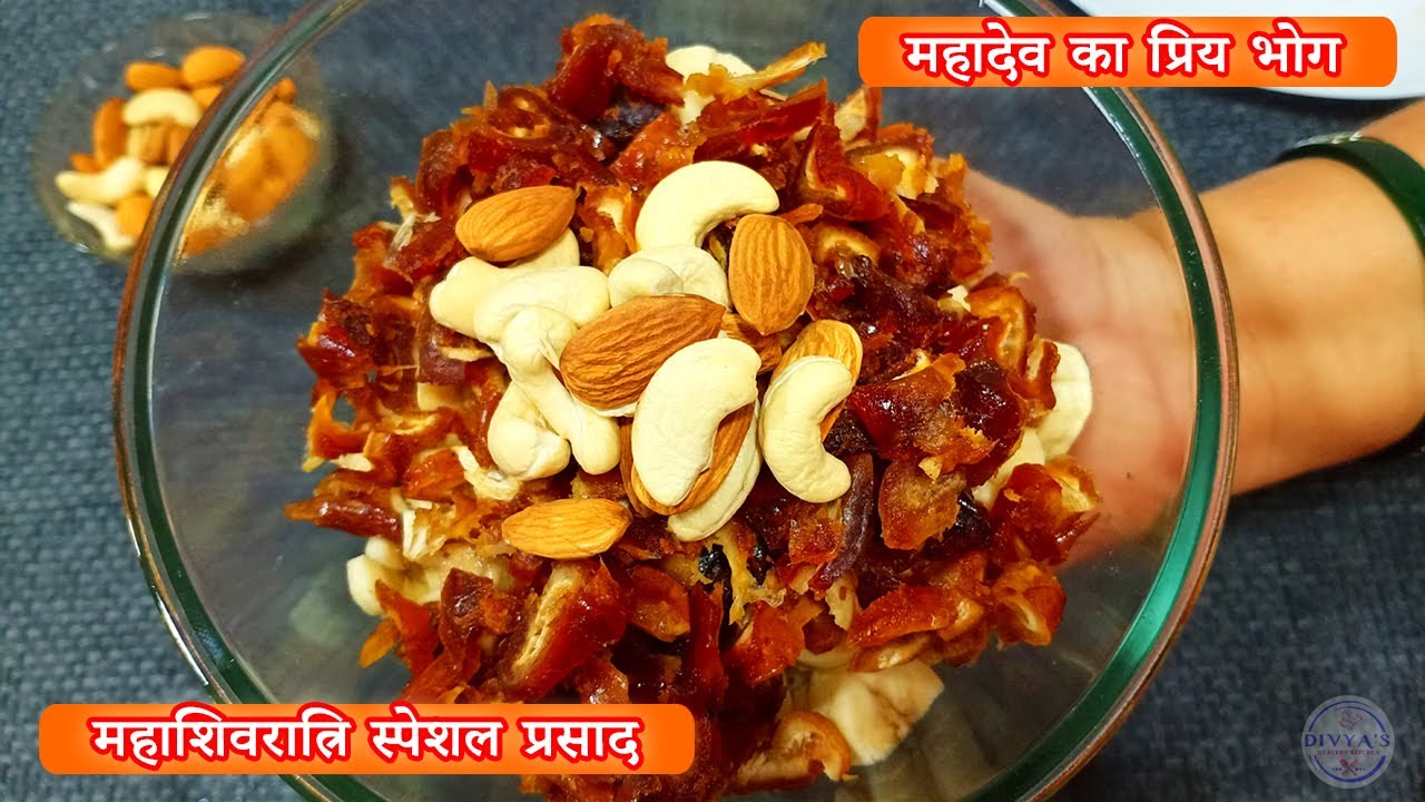 [संगीत] हेलो फ्रेंड्स दिव सेली किचन में आज हम देखेंगे महाशिवरात्रि का स्पेशल प्रसाद हेलो फ्रेंड्स मैं में आप का स्वागत करती को बनाने के लिए हमें 250 ग्राम पके हुए खजूर लेना है पाच से छह बनाना लेना है करीबन 100 ग्राम जैसे हमें ड्राई फ्रूट लेना है ड्राई