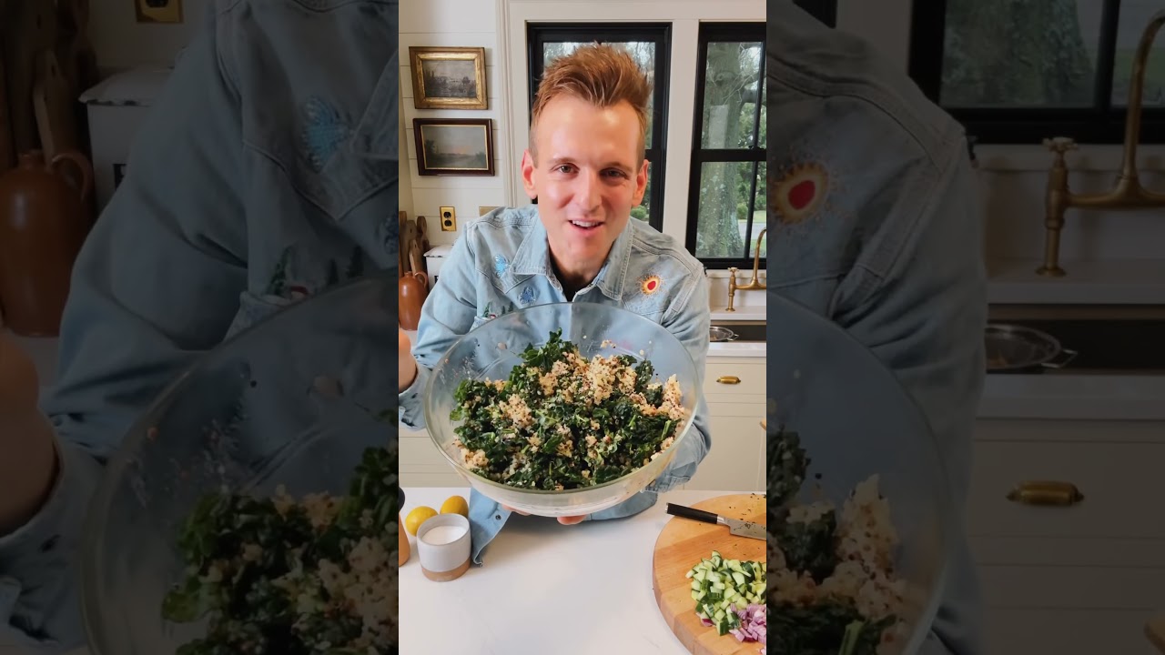 Kale so it wilts down and softens it Stir It Together slightly just to start wilting and softening that kale you can even pinch some of it just to notice it’s softer in texture now is the fun part that’s customizable I’m going to do chopped cucumber the seeds removed and