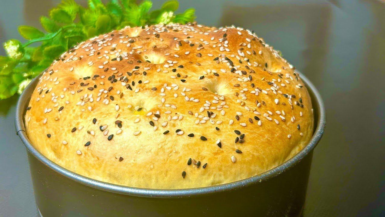 Grease a casserole dish with butter Mold diameter 18 cm Form a ball from the dough Let the dough rise in a warm plase fof 30 minutes Make holes in the dough Brush the dough with beaten egg Sprinkle bread with black and white sesame seeds